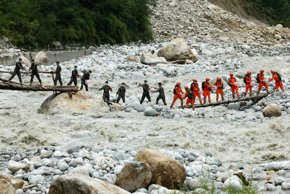 9月8日,在磨西鎮(zhèn)附近,救援人員站在臨時架設(shè)的小橋上向河對岸的村民運送生活物資。