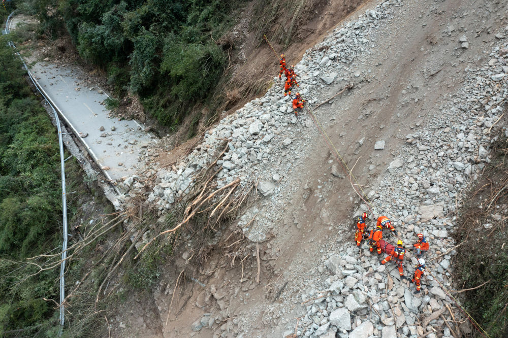 9月9日,搶險人員在搶通磨西鎮(zhèn)附近道路。