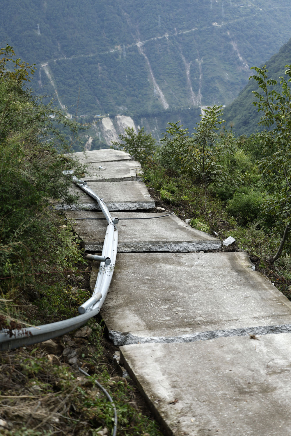 得知我們要去共和村,村干部叫來三輛摩托車,給車加了點汽油,送我們上去。上山的路本是只能容一輛汽車通過的水泥硬化路,經(jīng)過地震,沿途路面或裂開、或傾斜、或拱起、或塌陷,滑落的巨石和被撕扯下來的樹木把小路擋得只容摩托車通過,另一側(cè)就是深深的山溝。