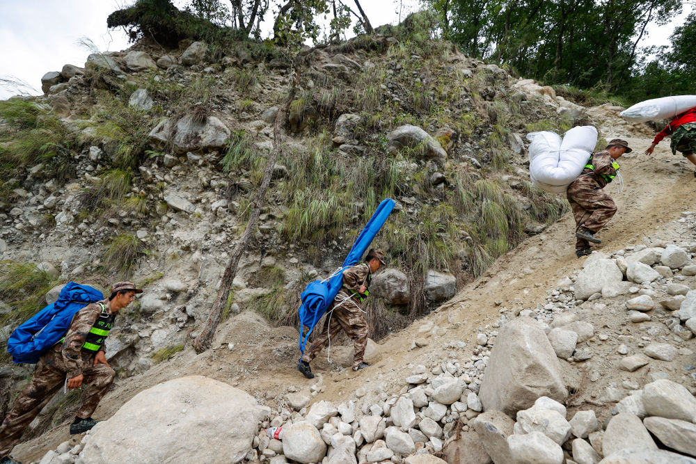 9月8日,在磨西鎮(zhèn)附近,救援人員沿著被地震損壞的小路向共和村運送救災(zāi)帳篷。