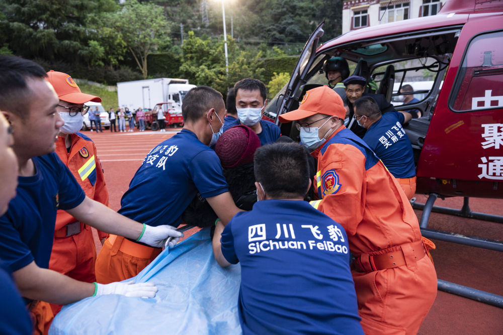 9月6日,在石棉縣中學(xué)的臨時起降點,救援人員在運送一名從石棉縣幸福村轉(zhuǎn)運來的受傷老人。