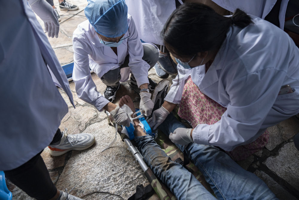 9月6日,在磨西鎮(zhèn)海螺溝廣場受災(zāi)群眾臨時安置點,醫(yī)護(hù)人員為傷員包扎。