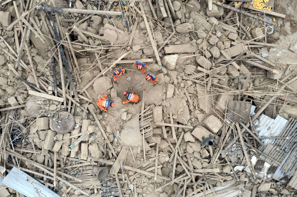 9月7日,四川眉山消防救援隊隊員在幸福村二組,幫助村民在倒塌的房屋中找尋物品。