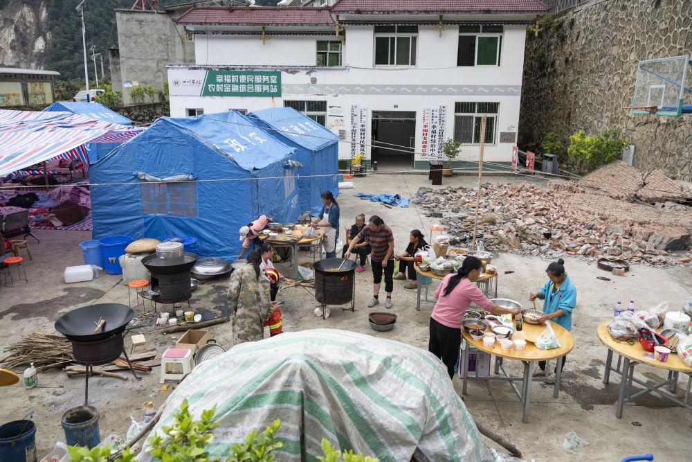 9月7日,在草科鄉(xiāng)政府安置點內(nèi),當(dāng)?shù)厝罕姙樵趫鼍仍藛T準(zhǔn)備飯菜。
