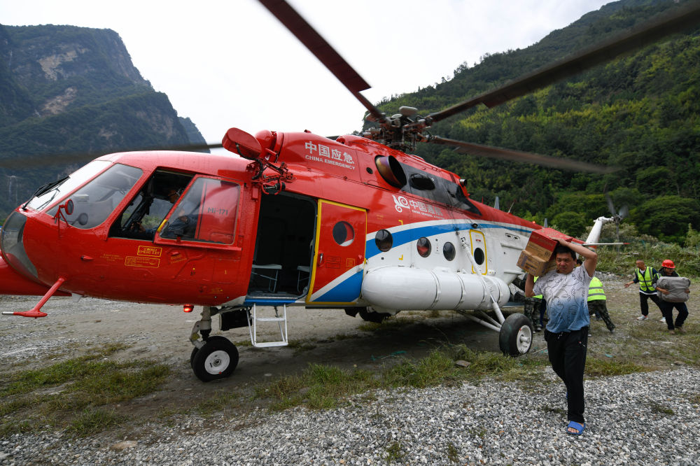 9月7日,搭載方便面和帳篷等救援物資的直升機(jī)抵達(dá)石棉縣草科鄉(xiāng),當(dāng)?shù)厝罕姲徇\物資。