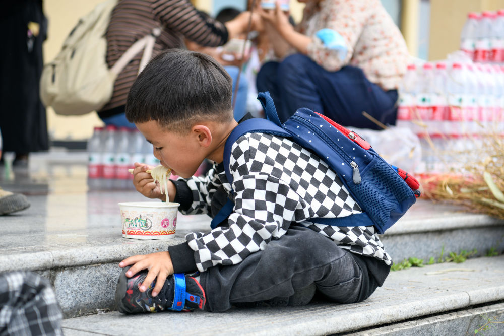 采訪當(dāng)天,這個安置點里的伙食團(tuán)依舊承包了在場所有村民、救援人員以及采訪隊伍的午飯,大家依次排隊領(lǐng)取,補充體力。一旁的草科鄉(xiāng)中心小學(xué)內(nèi),118名孩子也享用著熱氣騰騰的午飯。