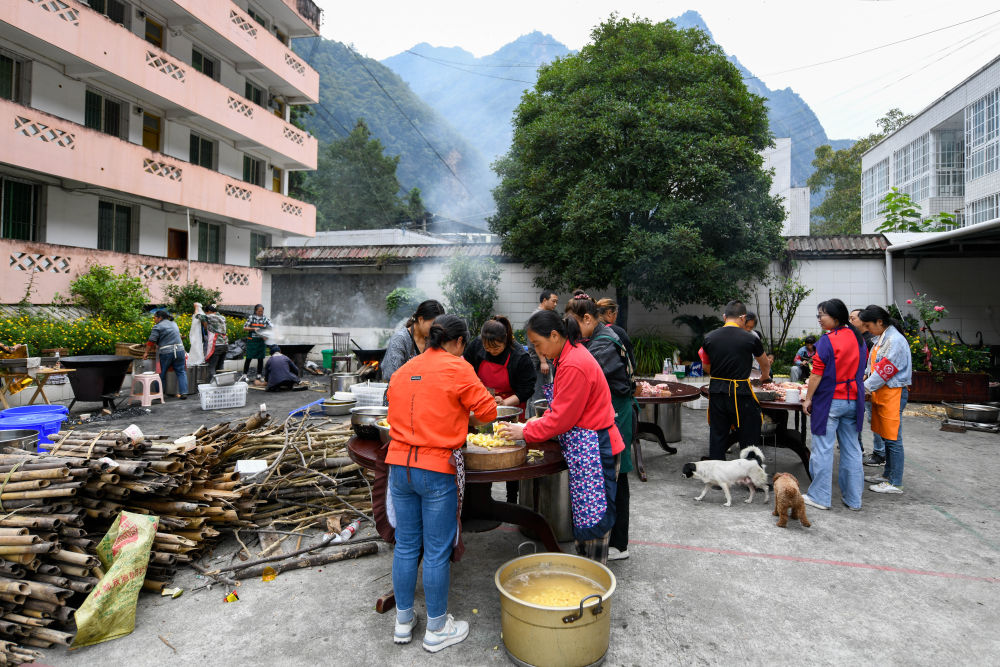9月7日,在草科鄉(xiāng)政府安置點內(nèi),當(dāng)?shù)厝罕娫跍?zhǔn)備午飯。