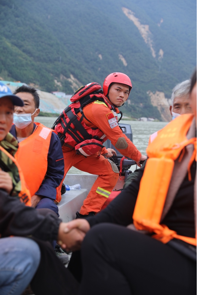 ↑9月8日,在四川石棉縣新民鄉(xiāng)臨時碼頭,救援人員駕駛沖鋒舟護(hù)送受災(zāi)群眾回家。