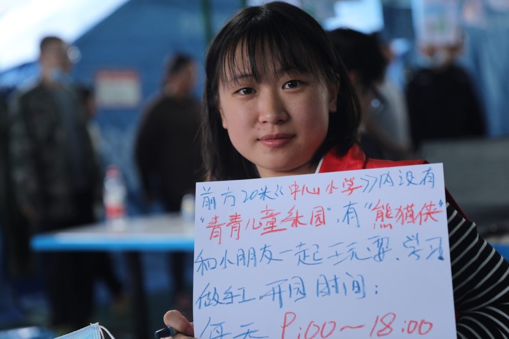 看到我手里的照相機(jī),他們十分好奇。一位叫駱雅萱的小朋友拉了拉我的衣角說:“姐姐,我想用你的相機(jī)給‘熊貓俠’拍一張照片好嗎?”“熊貓俠”是這里的一名志愿者,地震發(fā)生以來一直在安置點陪伴著小朋友們,大家都很喜歡她。我答應(yīng)了小朋友的請求,教她按下快門,看到自己拍的照片,她開心地給“熊貓俠”展示。