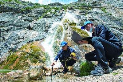 科考隊員范越(右)與董士琦在瀾滄江源區(qū)的溶洞出水口進行水質檢測。