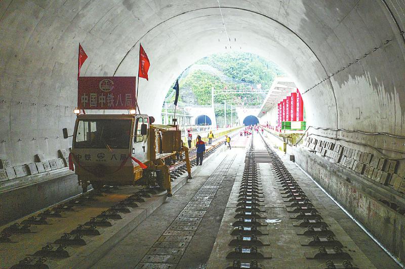 躍龍門隧道鋪軌現(xiàn)場。 成蘭鐵路公司供圖