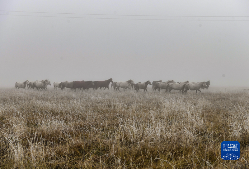 深秋的清晨,若爾蓋大草原籠罩在一片晨霧中,北風卷起牧草,枯黃的草葉和草梗上結(jié)滿了白霜。