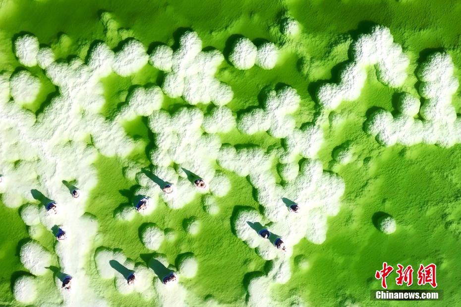 高原深秋,攝影愛好者在素有中國聚寶盆之稱的青海省海西蒙古族藏族自治州,拍攝察爾汗鹽湖的秋日美景。畫面中“萬丈鹽橋”“漂浮”在湖面上,翠綠或是淺綠色的鹵水好似盛在“聚寶盆”里的寶玉,秀色可餐。由于水分不斷蒸發(fā),鹽湖上形成堅硬的鹽蓋,青藏鐵路和青藏公路直接修建于鹽蓋之上。察爾汗鹽湖蘊藏有豐富的氯化鈉、氯化鉀、氯化鎂等無機鹽,總儲量達20多億噸,為中國礦業(yè)基地之一。 包雷 攝