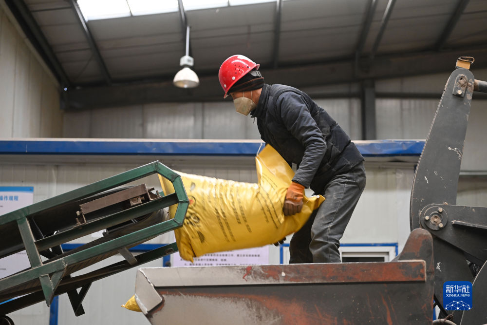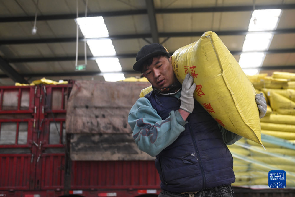 1月12日,青海省剛察縣一家飼料生產(chǎn)企業(yè),工作人員在搬運成品飼料。新華社記者 張龍 攝