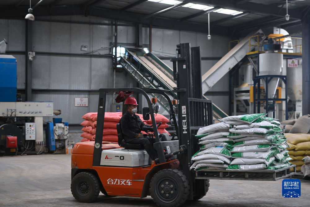 1月12日,青海省剛察縣一家飼料生產(chǎn)企業(yè),工人使用叉車搬運成品飼料。新華社記者 張龍 攝