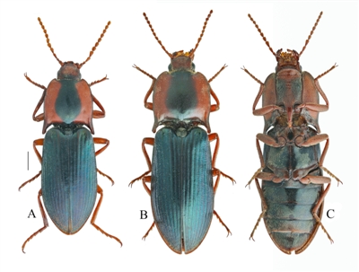 2022年6月17日,綿陽(yáng)師范學(xué)院團(tuán)隊(duì)來(lái)到四川省阿壩藏族羌族自治州黑水縣,開展草原有害生物普查工作。當(dāng)天下午6點(diǎn)過(guò),他們到達(dá)了黑水縣,在蘆花鎮(zhèn)四美村的一條土路旁,一只長(zhǎng)相新奇的甲蟲引起了許浩的注意?!八l(fā)現(xiàn)后趕緊叫住我,甲蟲呈現(xiàn)金屬藍(lán)色光澤,在其前胸背板的兩側(cè),都有紅色斑紋,長(zhǎng)得特別好看?!鼻聱樥f(shuō),“當(dāng)時(shí)初步判斷是一個(gè)金叩甲的物種,但以前從來(lái)沒(méi)見過(guò)。”