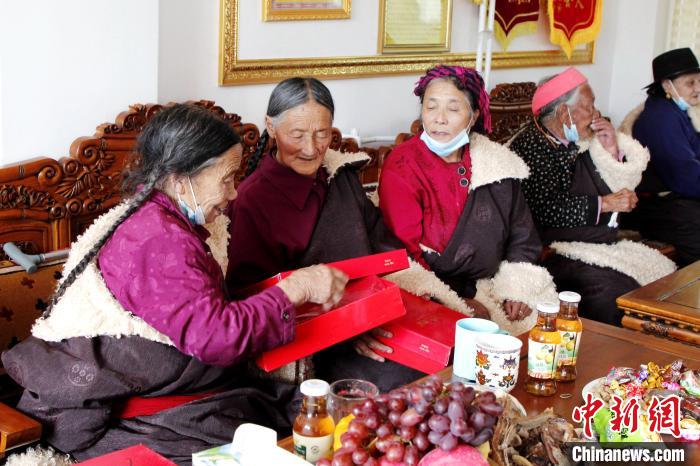 圖為同仁市社會(huì)福利服務(wù)中心的老年人拆開(kāi)自己的新春禮物。馬芝芬 攝