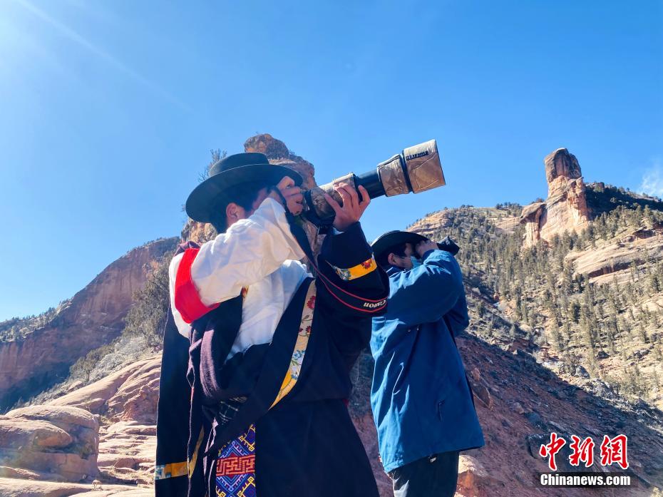 圖為達杰朋措(左)和生態(tài)管護員在瀾滄江源園區(qū)拍攝野生動物。仁青達杰 攝
