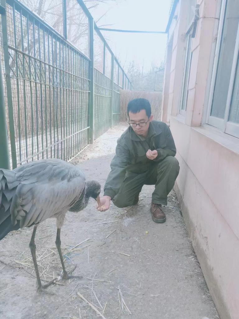2023年2月2日,飼養(yǎng)員張小波正在喂養(yǎng)“千鶴”。(西寧野生動(dòng)物園供圖)