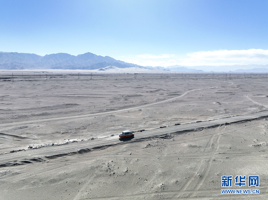 2月5日,青藏集團(tuán)有限公司西寧供電段格爾木檢修車間工長王永忠與同事駕車前往變電所進(jìn)行巡檢(無人機(jī)照片)。新華社記者 張龍 攝