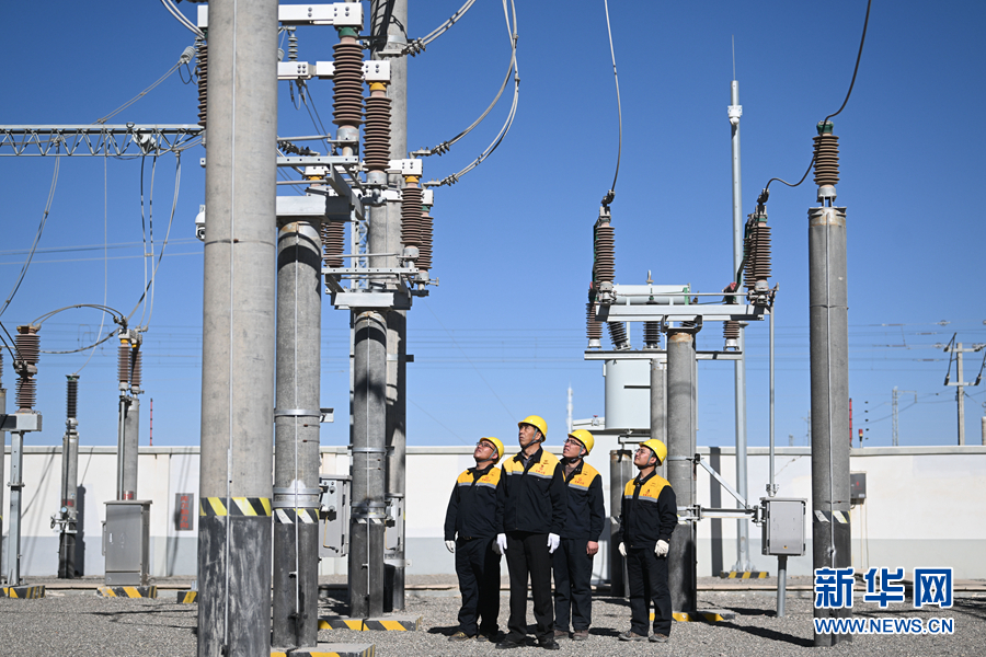 2月5日,在青藏集團(tuán)有限公司西寧供電段格爾木南變電所,王永忠(左二)與同事在巡檢供電設(shè)備。新華社記者 張龍 攝