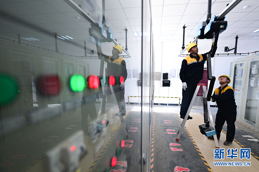 2月5日,在青藏集團(tuán)有限公司西寧供電段格爾木檢修車間,王永忠與同事在巡檢保護(hù)裝置柜。新華社記者 張龍 攝