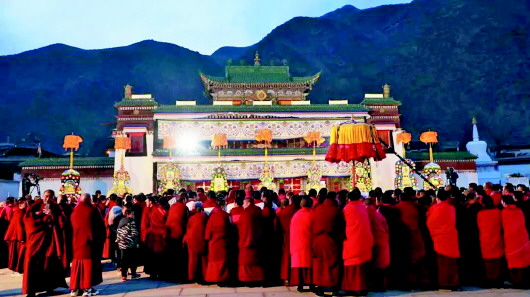 2月5日晚,夏河拉卜楞寺院內(nèi)法號長鳴、人山人海,正月十五酥油花展如期舉行。