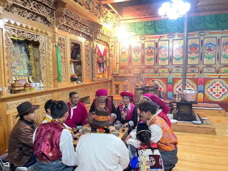 傍晚時(shí)分,“年夜飯”準(zhǔn)備完成,初稱站在火塘邊把剛和好的稀泥一層一層地刷到火塘上,“這是藏歷新年的添新土儀式(藏歷新年接福習(xí)俗),表示我們對(duì)來年日子風(fēng)調(diào)雨順、紅紅火火的美好期待。”初稱把這些傳統(tǒng)習(xí)俗認(rèn)真地教給家里的孩子們。