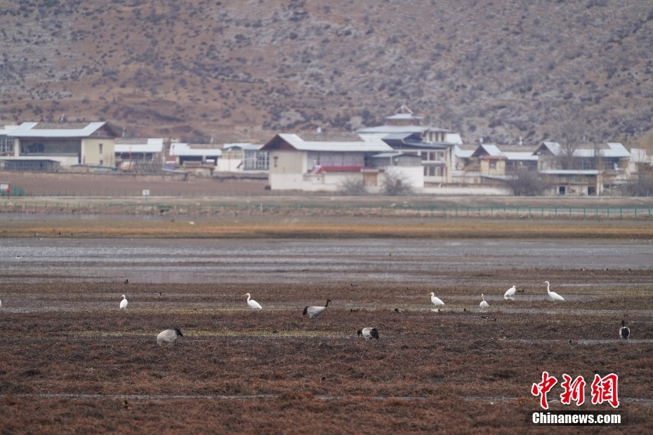2月21日,覓食的候鳥與納帕海遠處的村莊相映成趣。中新社記者 劉冉陽 攝