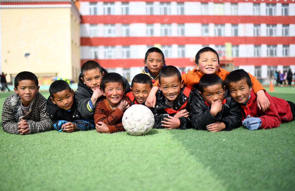 3月1日,在玉樹(shù)州治多縣,吉尕小學(xué)二年級(jí)學(xué)生才仁巴丁(左四)和小伙伴們?cè)趯W(xué)校的球場(chǎng)上。新華社記者 張宏祥 攝