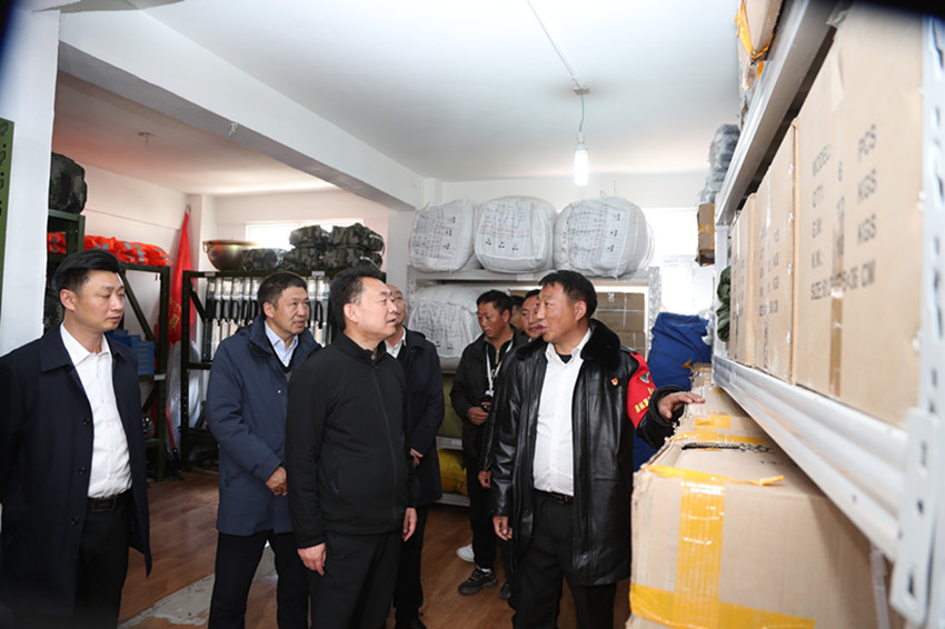 沈陽(yáng)在理塘縣麥洼鄉(xiāng)察看應(yīng)急物資儲(chǔ)備情況。