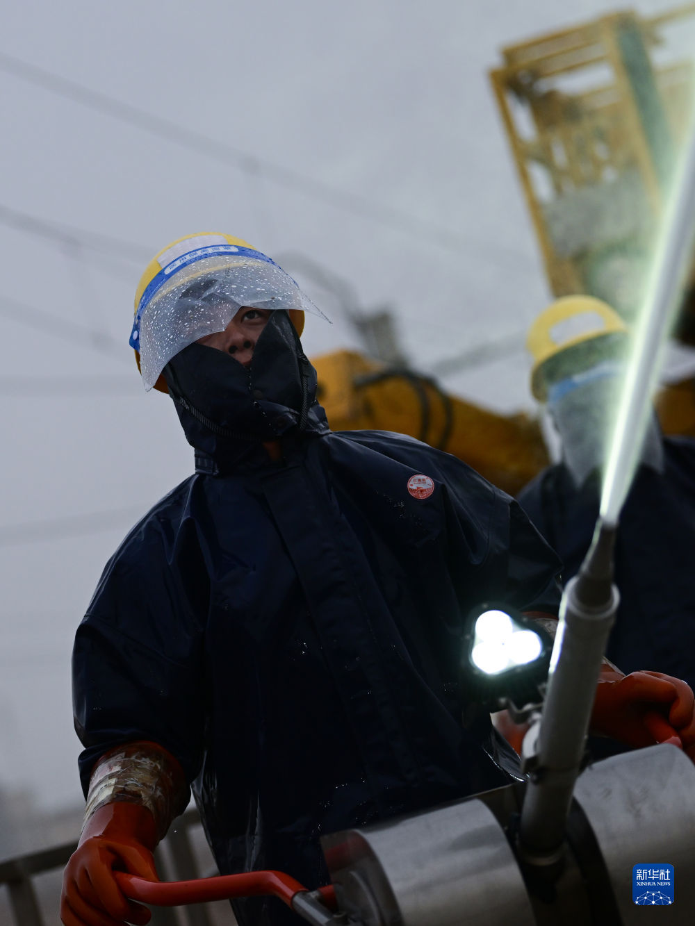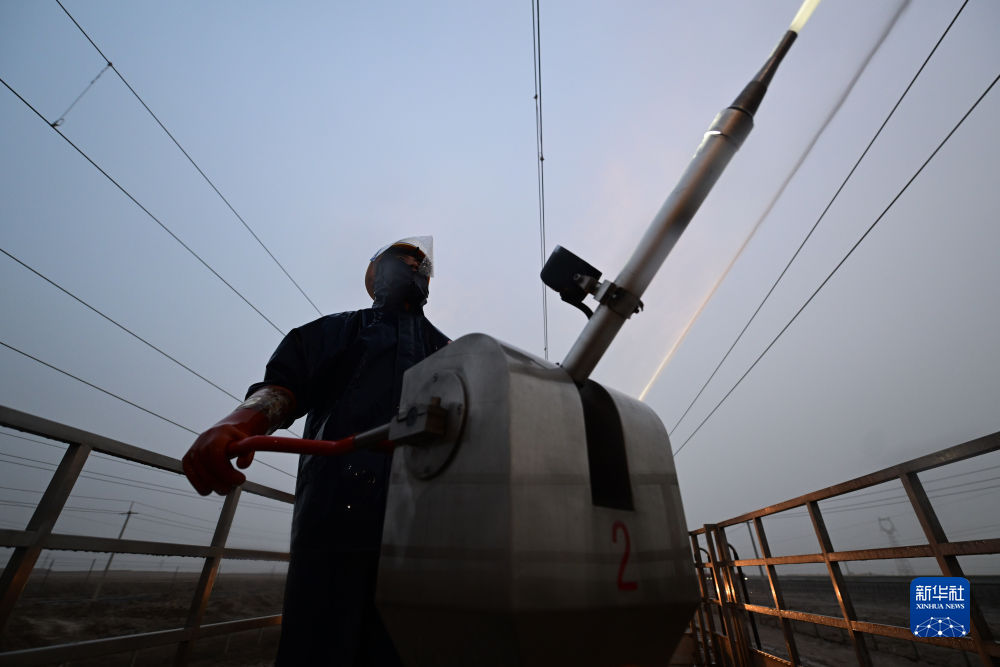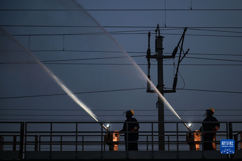 4月20日,中國鐵路青藏集團(tuán)有限公司西寧供電段格爾木大修車間大修網(wǎng)工區(qū)檢修工使用高壓沖洗水槍對絕緣子設(shè)備進(jìn)行清洗。新華社記者 張龍 攝
