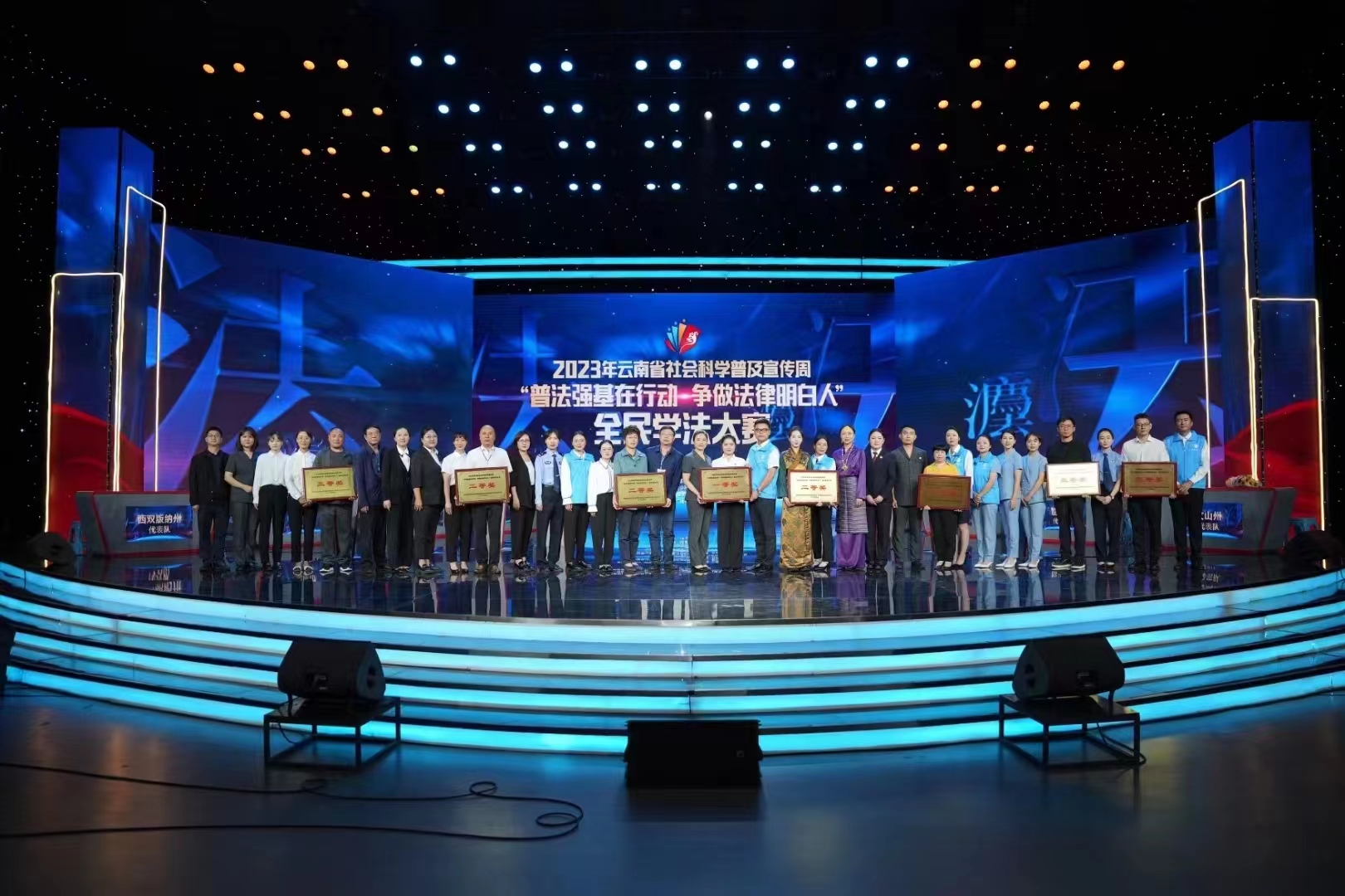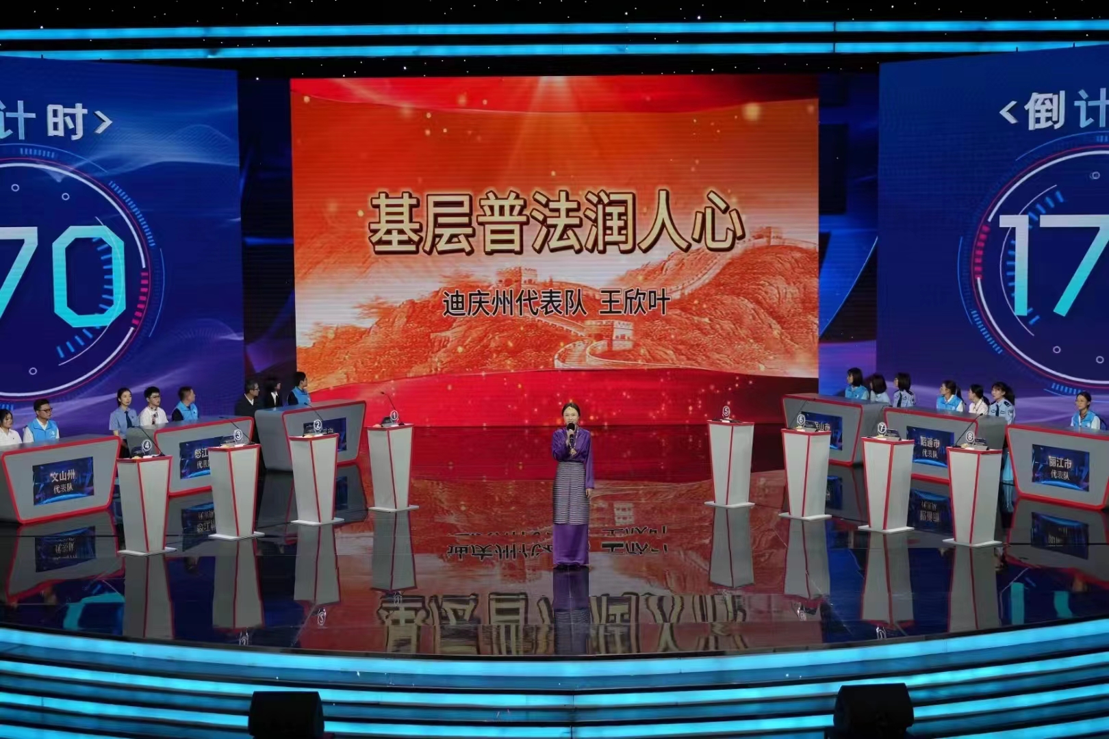 據(jù)悉,此次活動由云南省委宣傳部、省委政法委、省司法廳、省社科聯(lián)等11家單位主辦,將開展近300項重點活動,推進法治宣傳進農(nóng)村、進社區(qū)、進校園、進機關(guān)、進企業(yè)、進軍營、進網(wǎng)絡(luò)。此次“普法強基在行動·爭做法律明白人”全民學法大賽全省16個州市組隊參加,每支參賽隊由村(社區(qū))法律明白人、鄉(xiāng)鎮(zhèn)中小學教師、擔任鄉(xiāng)鎮(zhèn)中小學法治副校長的基層政法干警各1人組成。經(jīng)過各州市選拔賽和半決賽的激烈角逐,共決出8支隊伍進入電視總決賽。決賽包含必答題、挑戰(zhàn)答題、兩隊對戰(zhàn)、風險題、演講賽五個環(huán)節(jié)。