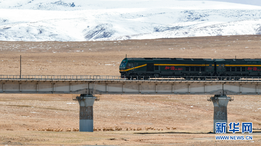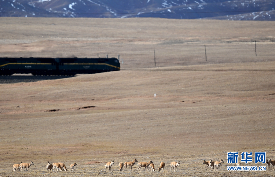 一群藏羚羊在青海省玉樹藏族自治州境內(nèi)的草原上活動(dòng),一列火車行駛在它們身后的青藏鐵路上。新華社記者 張宏祥 攝