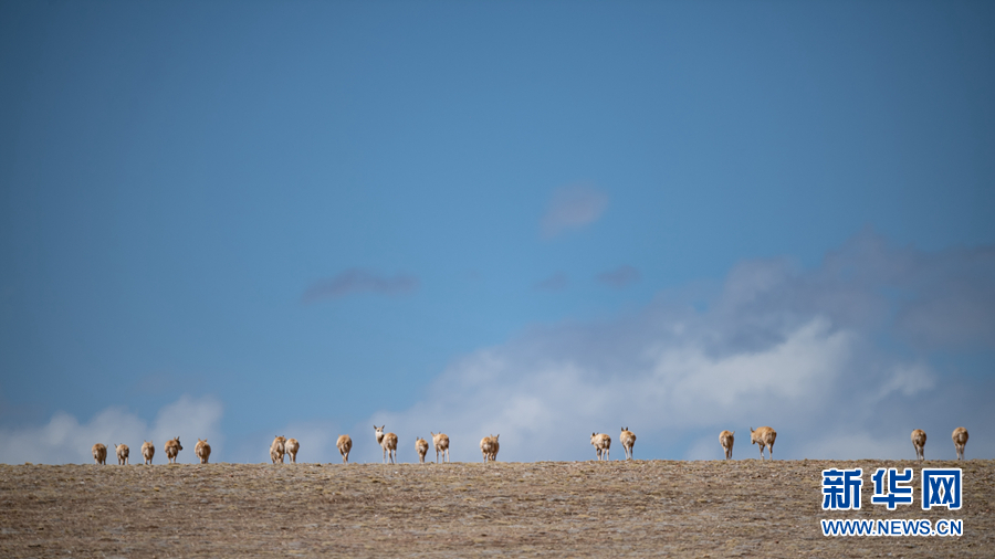一群雌性待產(chǎn)藏羚羊在青海省玉樹藏族自治州境內(nèi)活動(dòng)。新華網(wǎng) 潘彬彬 攝