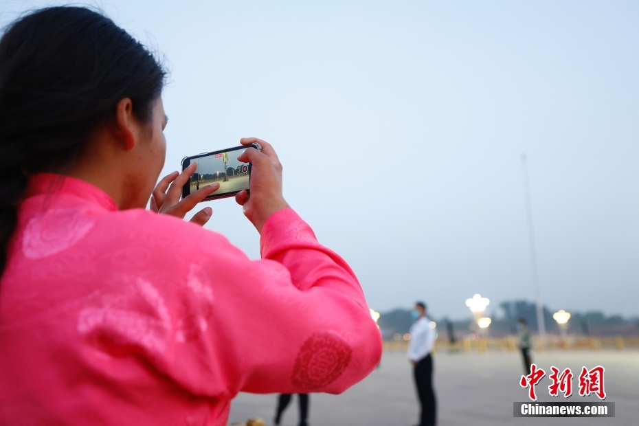 圖為藏族少年用手機記錄升旗儀式的瞬間。中新社記者 富田 攝