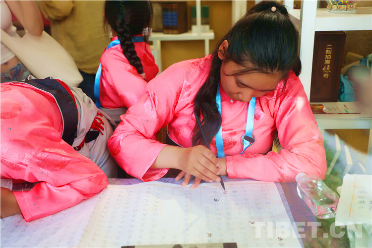 當(dāng)穿著藏裝的姑娘走過書架,翻開四大名著,努力讀出上面的文字,在古香古色的書桌前,幾個(gè)姑娘爭先用毛筆描繪著宣紙上的小楷,那畫面美得像一幅幅仕女畫。