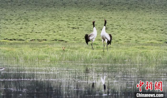 圖為黑頸鶴在青海境內(nèi)濕地內(nèi)棲息。祁連山國(guó)家公園青海省管理局供圖