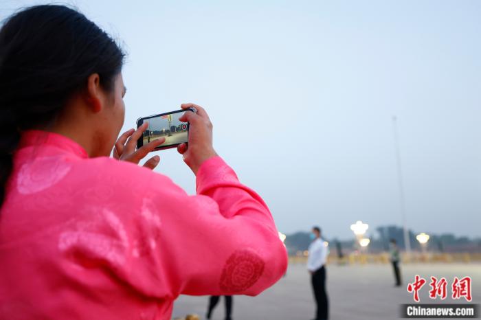 “六一”兒童節(jié)一早,來(lái)自青海省玉樹(shù)藏族自治州兒童福利院的部分藏族青少年在天安門(mén)廣場(chǎng)觀(guān)看升旗儀式。圖為鬧增拉毛在拍攝五星紅旗。中新社富田 攝