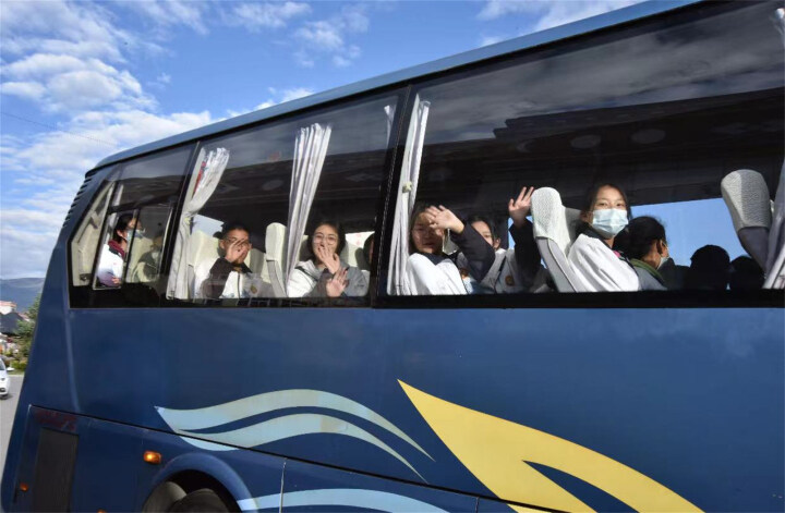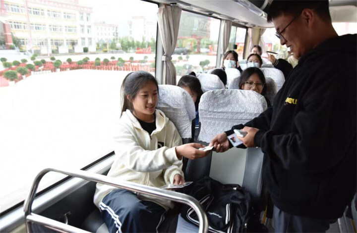 考生們登上開(kāi)往考場(chǎng)的大巴車。
