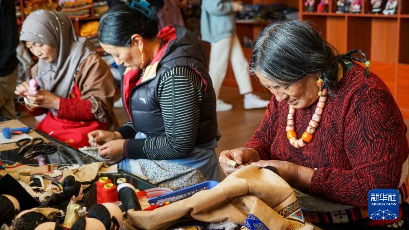 在若爾蓋縣唐克鎮(zhèn)白河社區(qū),“吉祥娃娃”手工社的社員們?cè)谥谱鳌凹橥尥蕖薄P氯A社記者 尚文意 攝
