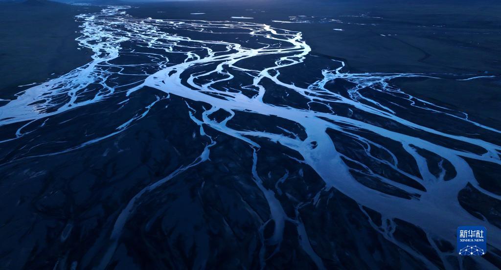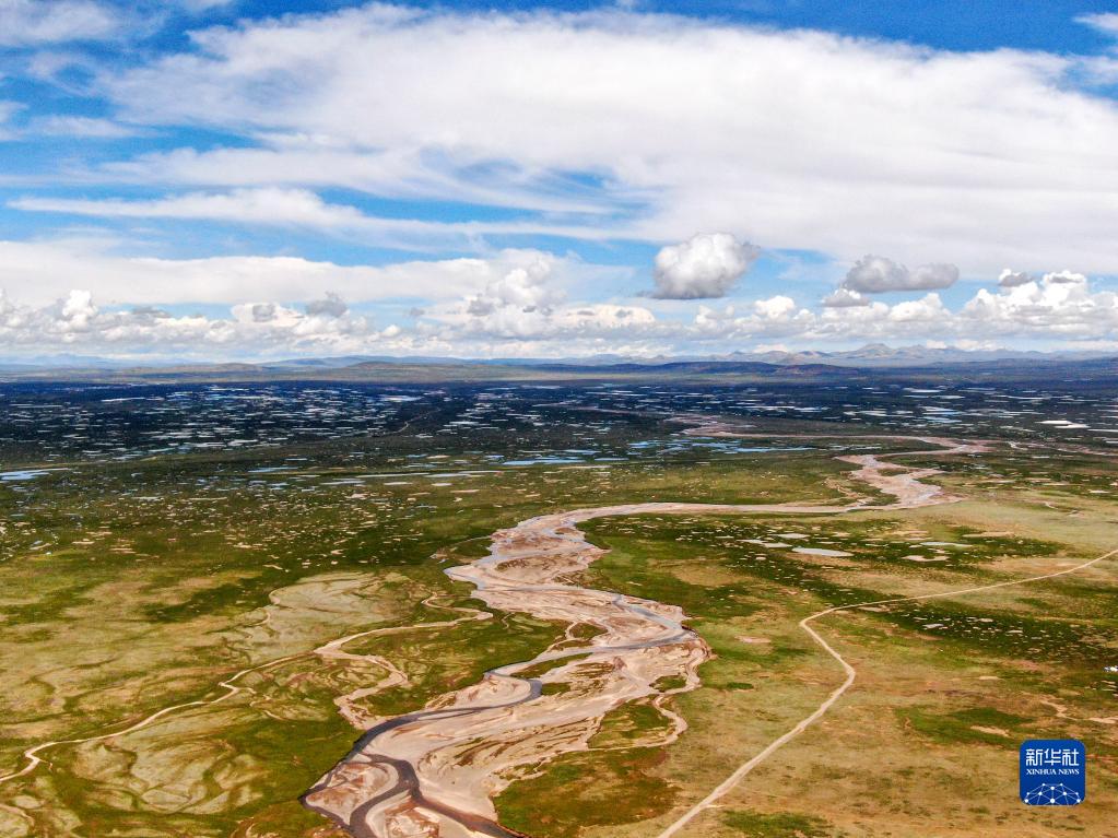 這是2022年7月27日在長江源地區(qū)拍攝的囊極巴隴河道,長江正源沱沱河和南源當(dāng)曲在此匯合(無人機照片)。新華社記者 肖藝九 攝