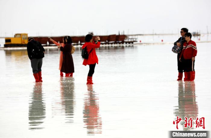 圖為茶卡鹽湖景區(qū)內(nèi),游客合影留念?!⊙Φ?攝