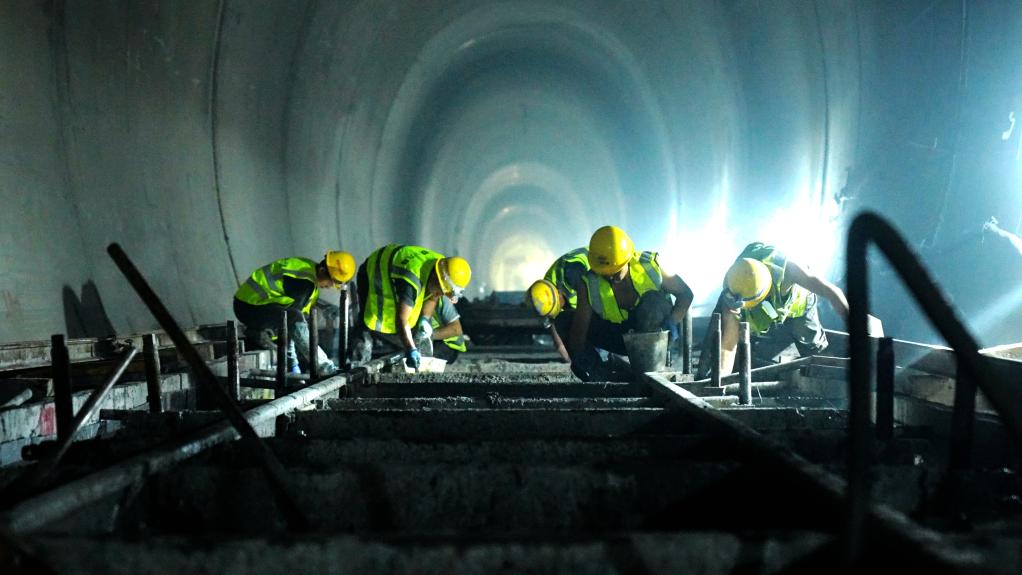 7月8日,滇藏鐵路麗香段哈巴雪山隧道內,建設者進行無砟道床施工。新華社記者 丁怡全 攝