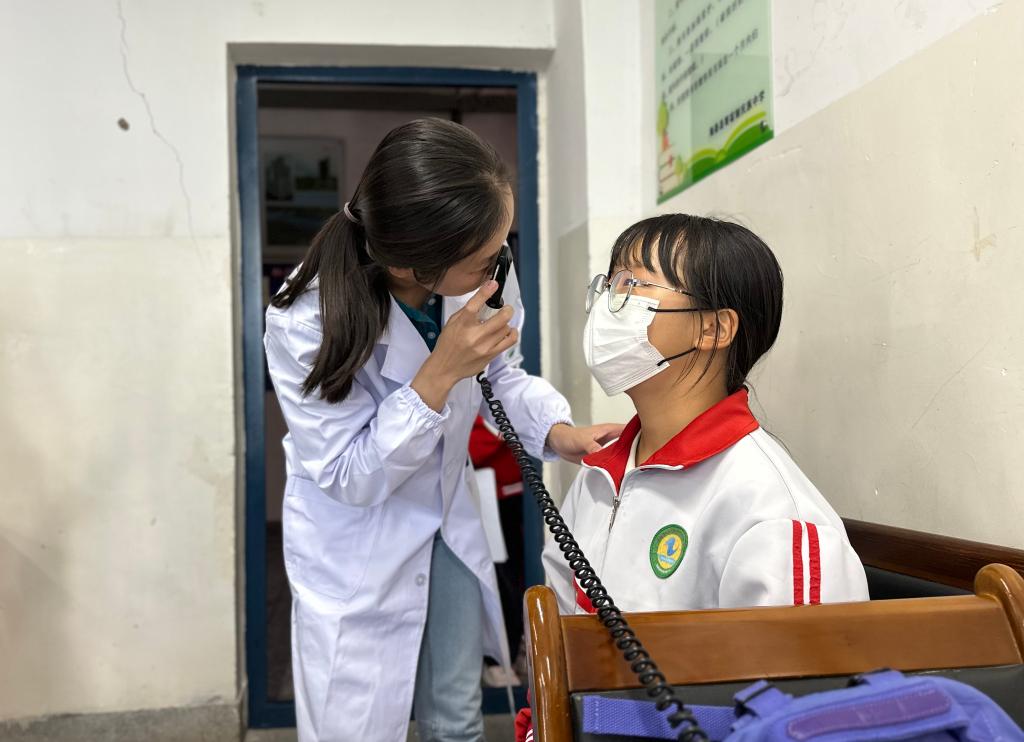 教學(xué)樓里,10名北京協(xié)和醫(yī)院的專家兩人一組,為200名學(xué)生進(jìn)行骨科、眼科、兒科綜合檢查?!翱凑胺?。佩戴眼鏡后一定要按期復(fù)查。課間可以摘下眼鏡按摩一下,避免過度用眼?!北本﹨f(xié)和醫(yī)院眼科專家李冰一邊拿著檢眼鏡細(xì)心檢查,一邊耐心地講解用眼知識(shí)。