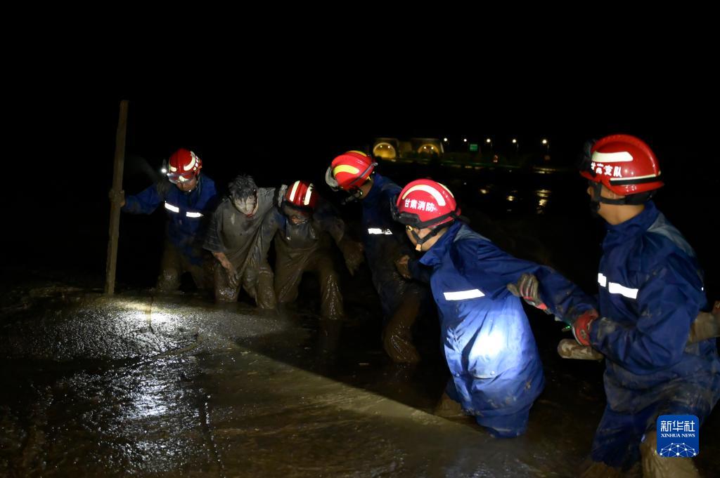 7月11日凌晨,當(dāng)?shù)鼐仍α吭陂_展人員搜救工作。新華社發(fā)(夏河縣消防救援大隊供圖)