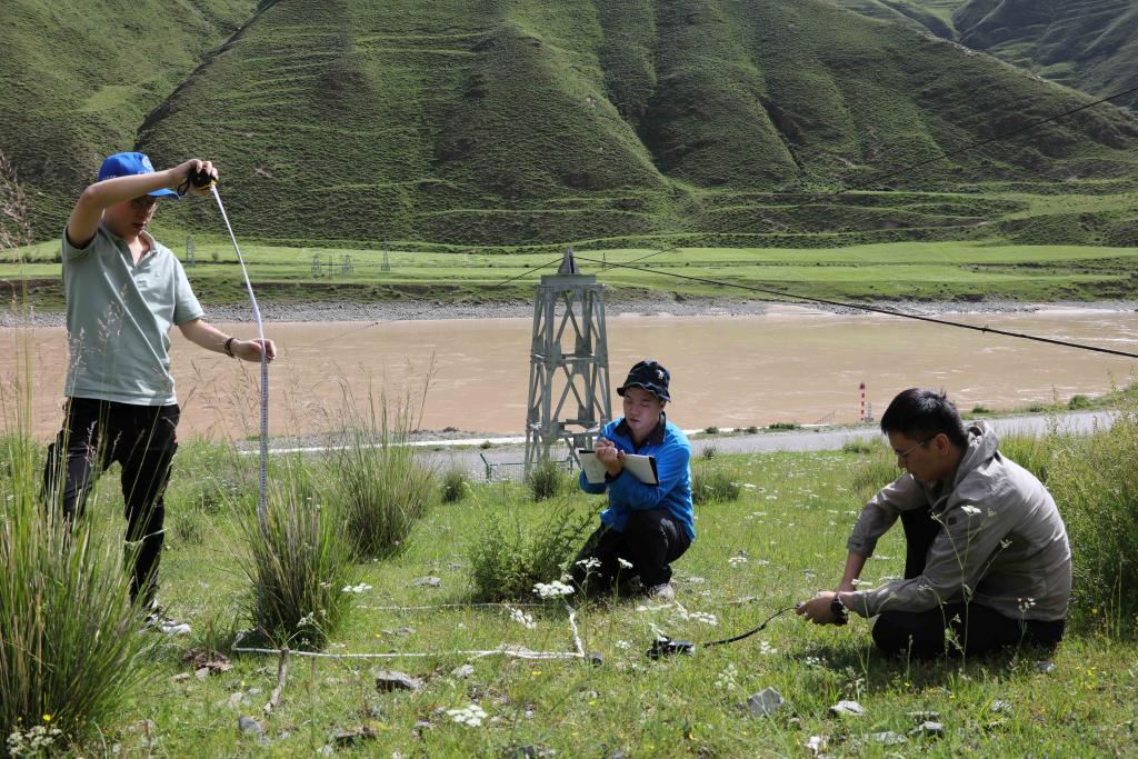 7月22日,長(zhǎng)江科學(xué)院水土保持研究所的科考隊(duì)員在通天河直門達(dá)河段進(jìn)行植被樣方調(diào)查。新華社記者 劉詩平 攝