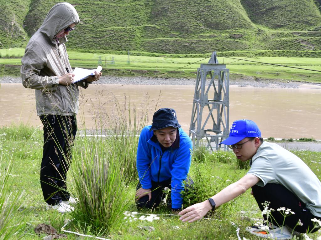 這是2023年江源綜合科考隊(duì)員任斐鵬(中)、李昊(左)、嚴(yán)智偉在長江源區(qū)的通天河直門達(dá)河段開展植被樣方調(diào)查。新華社記者李勁峰 攝