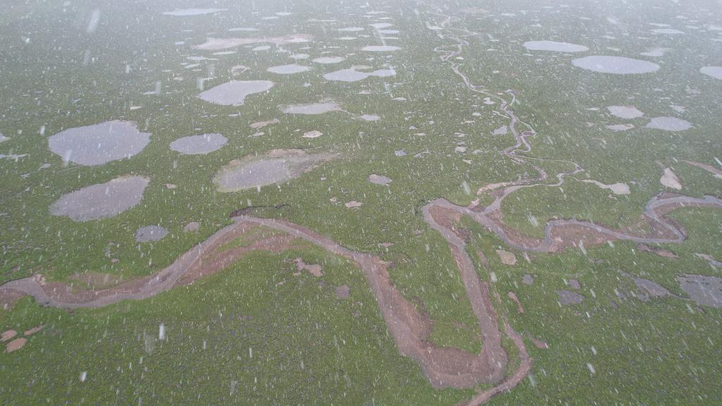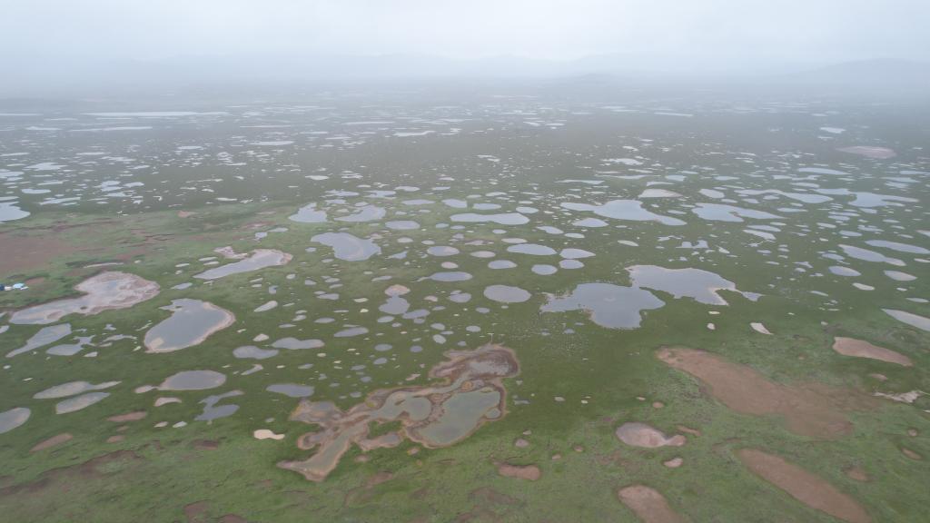 記者在距離當(dāng)曲源頭不到10公里處升起無人機(jī)看到,沼澤濕地中,大大小小的沼澤湖泊星羅棋布。