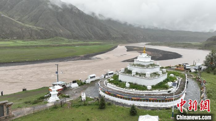 連日來雨水持續(xù),清晨的通天河挾卷泥沙,波濤涌動,河中央的月牙形沙洲被沖刷出柔美的弧線。四周群山青翠、霧靄繚繞,白塔靜靜佇立在古渡口邊,似水墨畫頗具詩意。石階延伸處,牧人緩緩走過轉(zhuǎn)經(jīng)筒,遠(yuǎn)處村莊籠罩在一片朦朧中。
